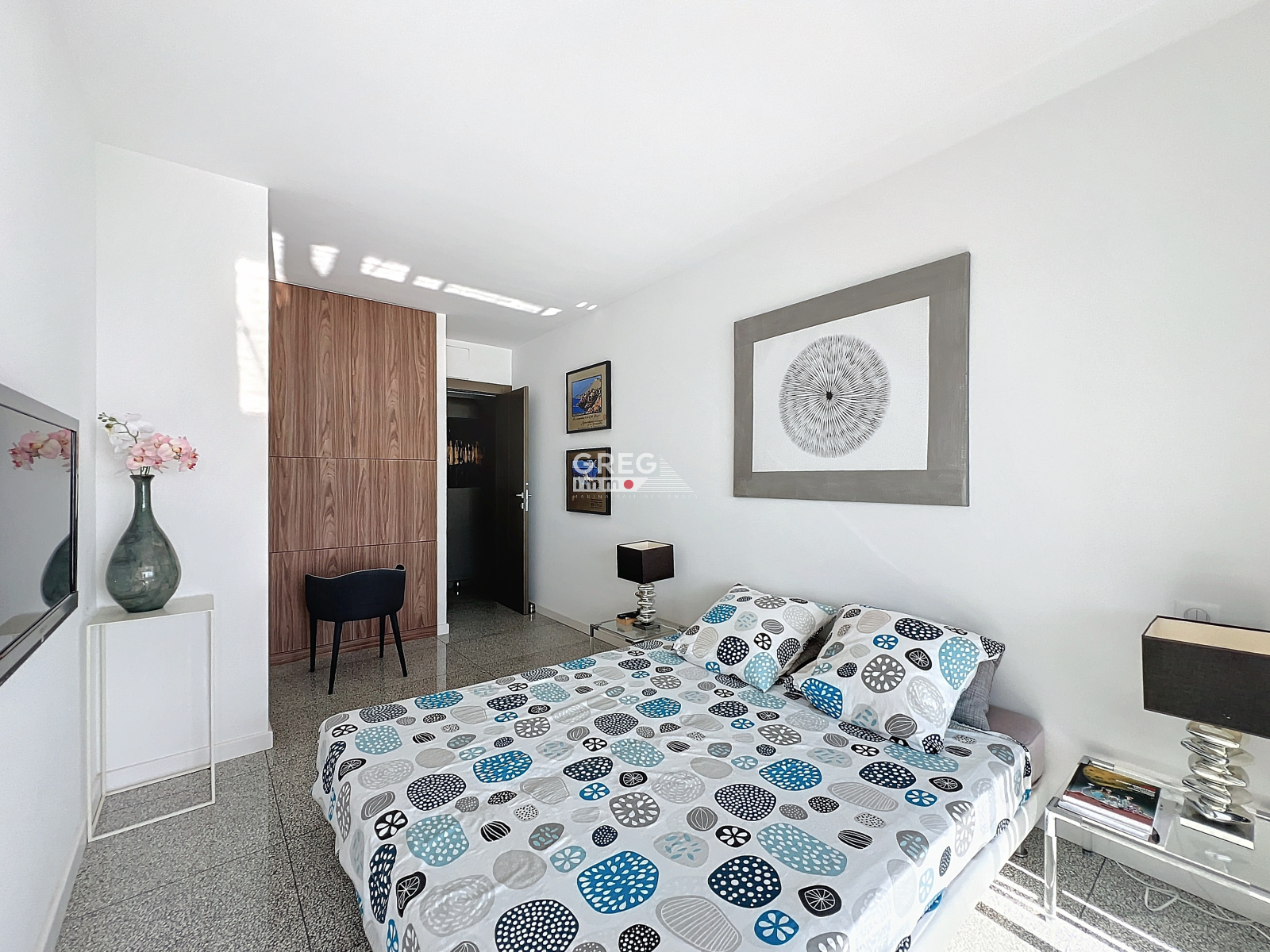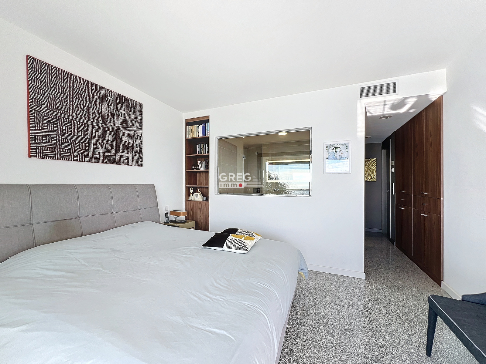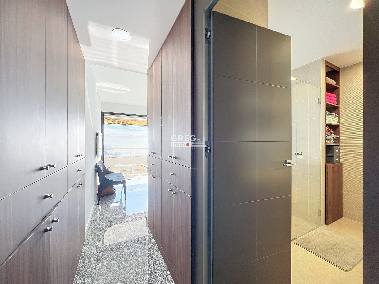 L'appartement propose une suite parentale élégante avec une superbe douche à l'italienne offrant une vue imprenable sur la mer, ainsi que deux chambres avec rangements et une salle d'eau avec WC.